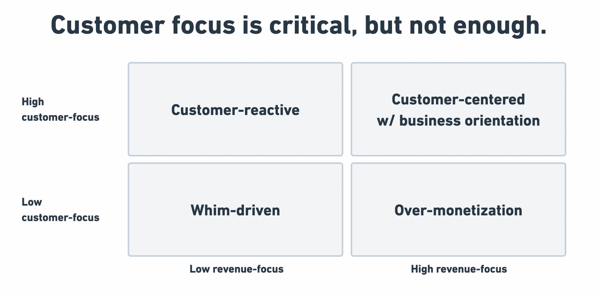 - Customer-centered & business oriented (high customer-focus, high revenue-focus) teams focus on solving the right customer problems that unlock long-term business value. When UX and revenue are in tension, they carefully manage the balance. A shining example is Google in the 1990s when they resisted over-monetizing the massive traffic to their search page. See my post Balancing Short-Term and Long-Term Product Bets for a deep dive into Google's approach.