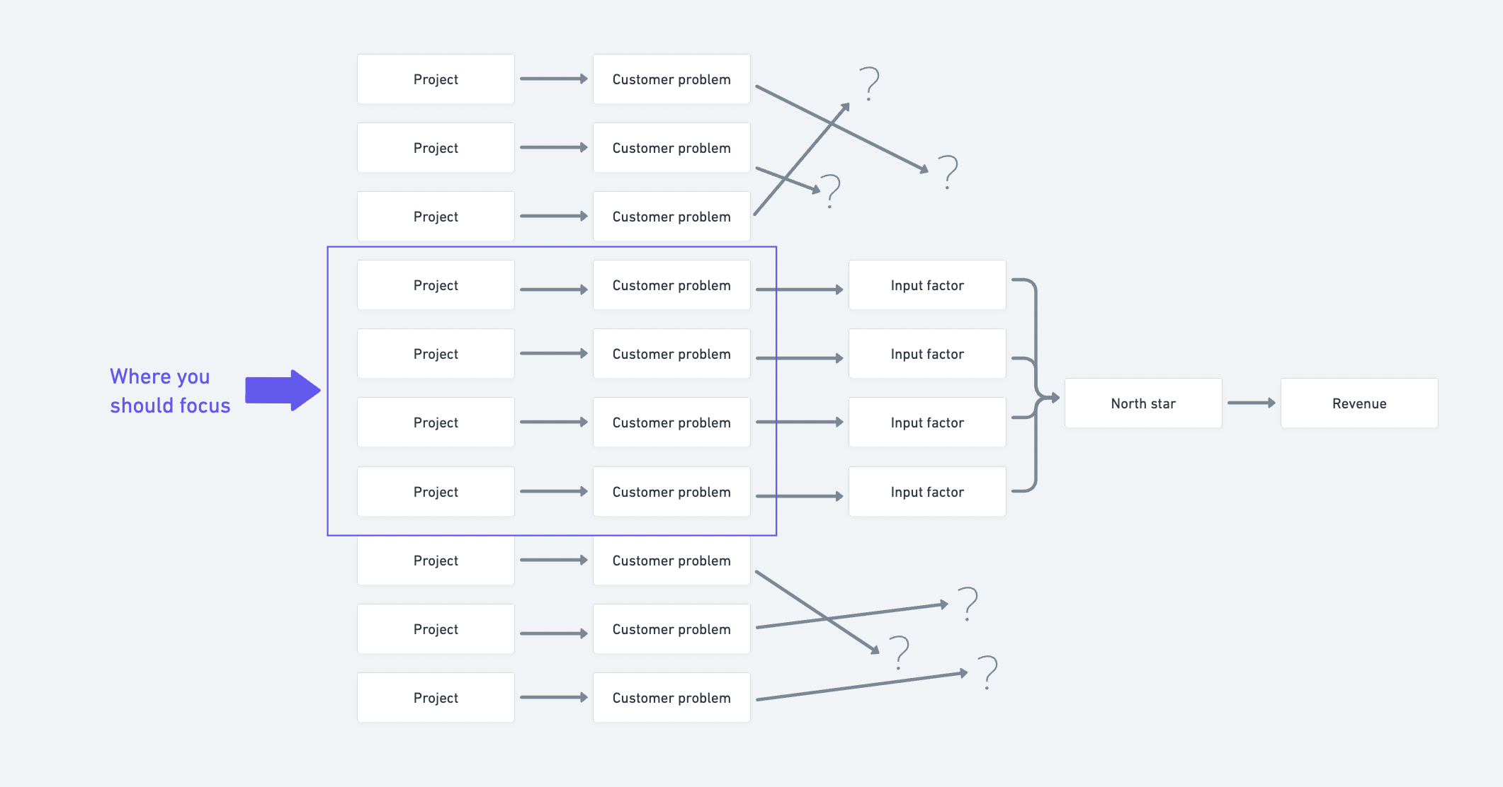 The customer problems in the highlighted area connect to inputs tied to a North Star and long-term revenue goals. The other customer problems, while legitimate problems for real people, don't tie into the strategy.