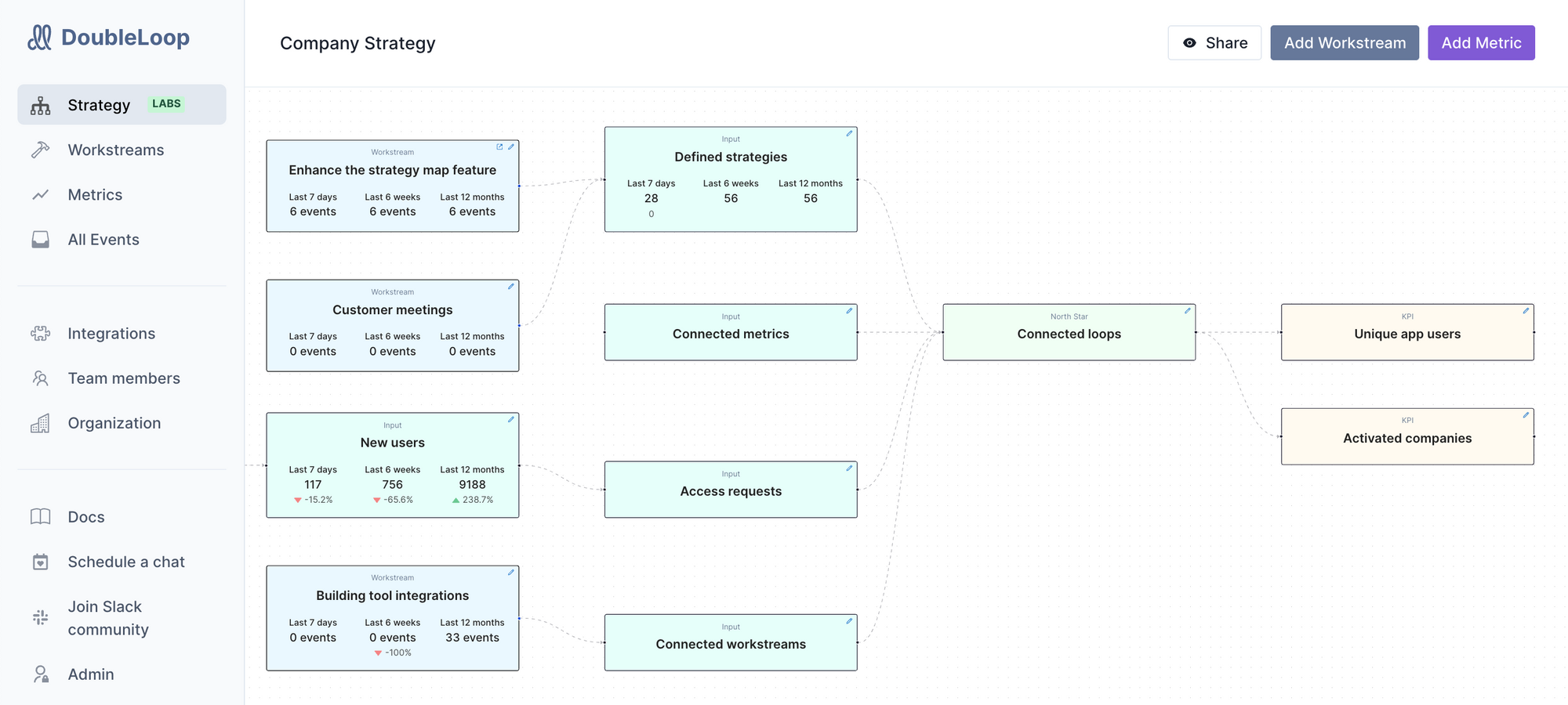 We’re building DoubleLoop to be your system-of-record of the relationships between your work and metrics. DoubleLoop enables you to map how all the pieces come together, align your team around it, keep it in sync with reality, and iterate.
