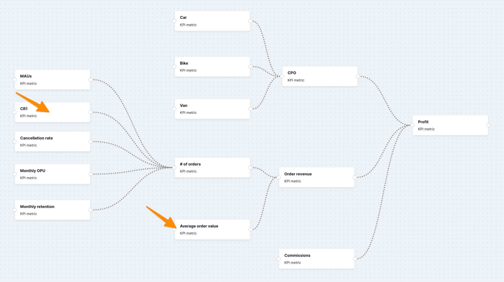 When defining a product strategy for a period of work, consider the KPI tree for a delivery marketplace. It would be ill-advised to try to influence every metric in the model. Instead, you can use the model to identify a small number of leverage points to focus on.
