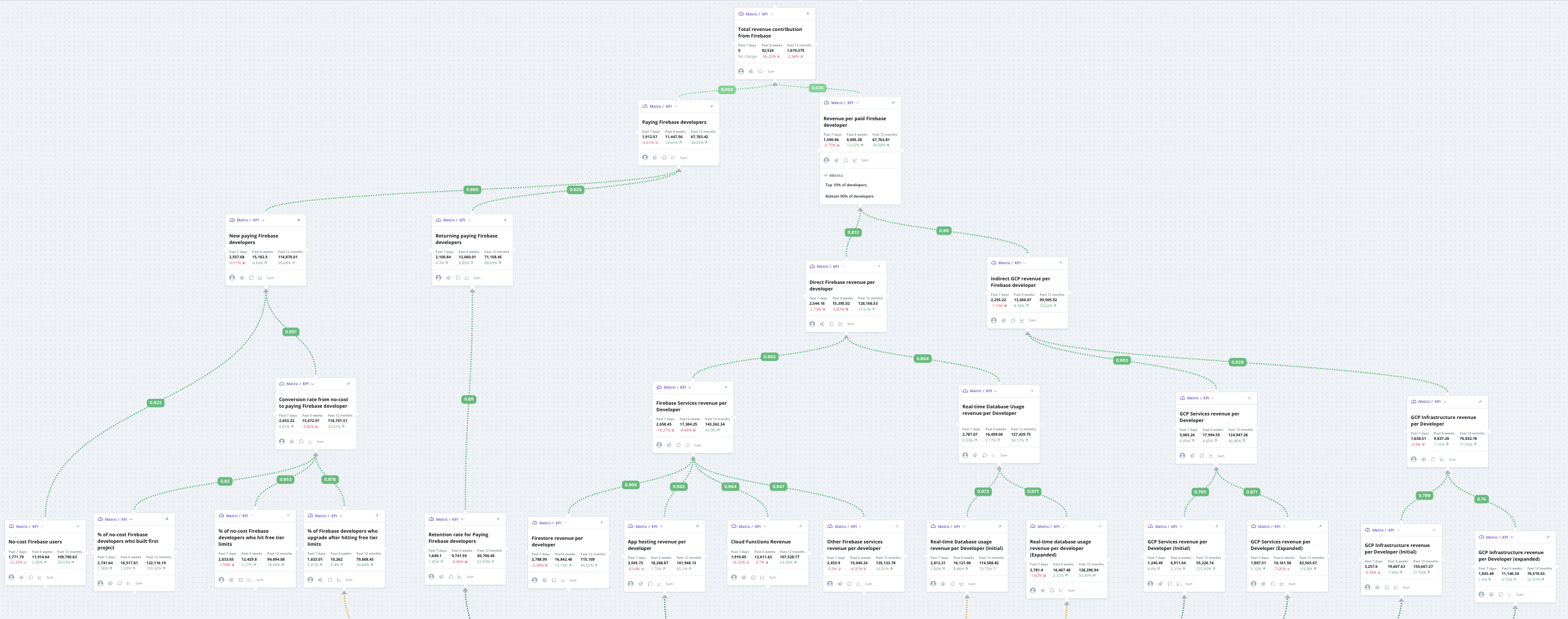 Each KPI gets more granular and actionable as you move down the tree. While the total number of Paying Firebase Developers may be difficult for any one team to influence, its component KPI, "% of No-Cost Firebase Developers who Hit Free Tier Limits" is more controllable.
